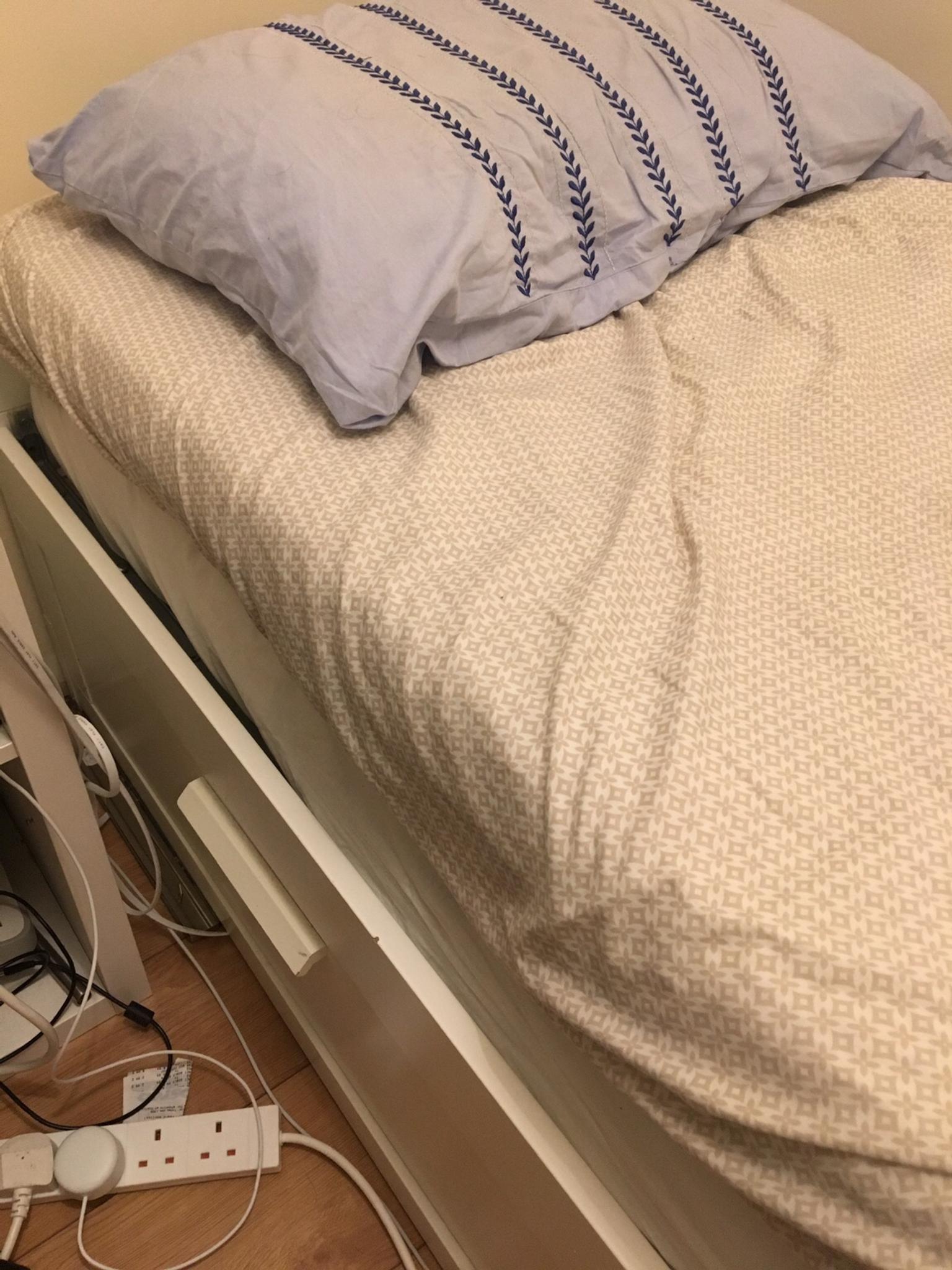 Ikea's brimnes bed frame has four fairly large drawers (perfect for s storing chunky sweaters or bedsheets). Lightly used ikea brimnes bedframe with 4 drawers and headboard. How to assemble ikea brimnes bed frame with storage, standard double. 90 1/8 ' (229 cm) width: The storage boxes under the bed provide plenty of storage to store quilts, beddings or even clothes!
